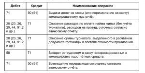 В таблице наглядно видно, что деньги, выданные командированному перед поездкой, учитываются по дебету счёта 71 «Расчёты с подотчётными лицами», а произведённые расходы — по кредиту счёта 71 в корреспонденции со счетами учёта затрат.