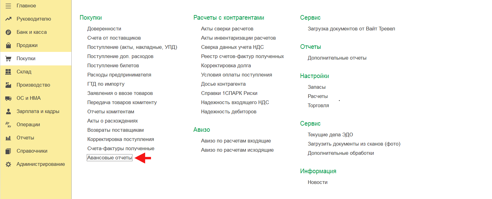 Для открытия журнала документов «Авансовые отчёты» необходимо перейти в раздел «Покупки» — «Авансовые отчёты».