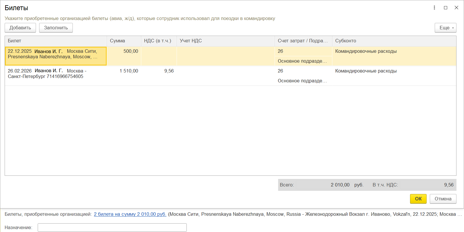 При переходе по гиперссылке отображается форма «Билеты» с заполненной модулем табличной частью, билеты отражаются на счёте затрат 26. Доступно удаление строк табличной части при необходимости корректировки отражения билетов.