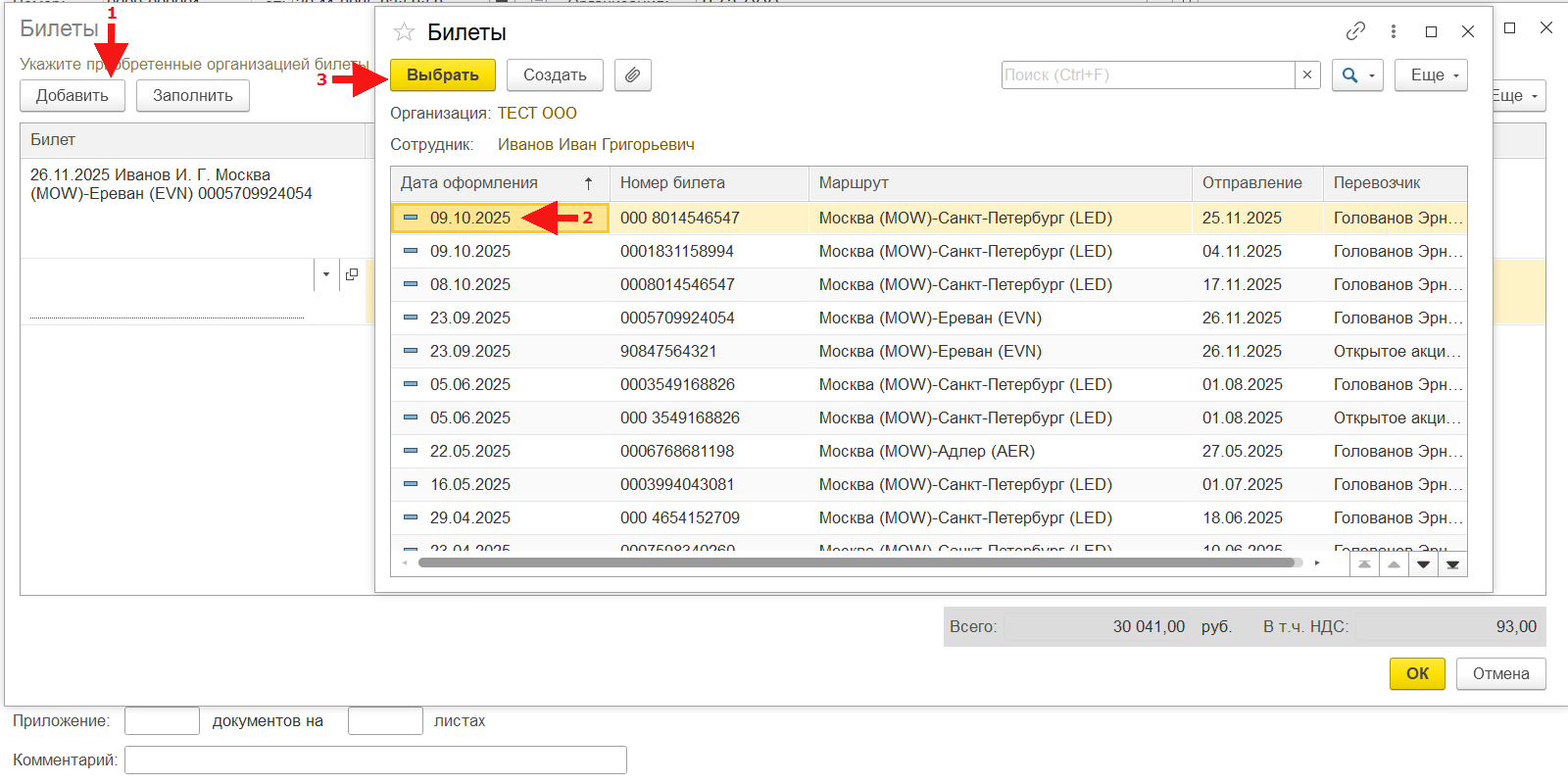 Также доступно добавление строк табличной части при необходимости корректировки отражения билетов с помощью команды «Добавить» и формы выбора элементов Справочника «Билеты» с автоматически выставленными отборами: «Организация», «Сотрудник».