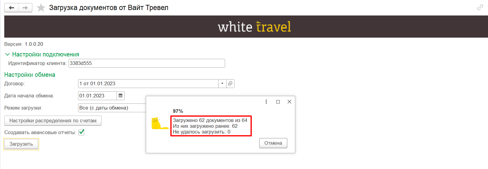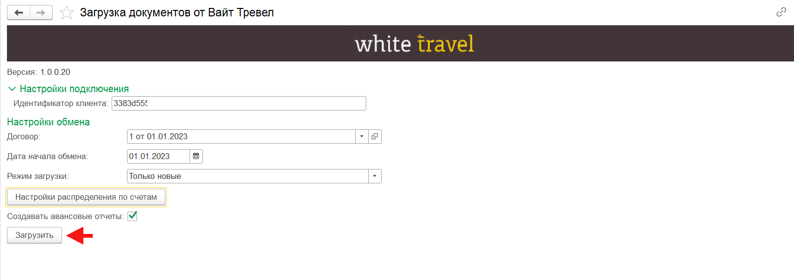 Для старта загрузки документов в систему необходимо перейти в обработку «Загрузка документов от Вайт Тревел» (раздел «Покупки» — подраздел «Сервис») и нажать команду «Загрузить».