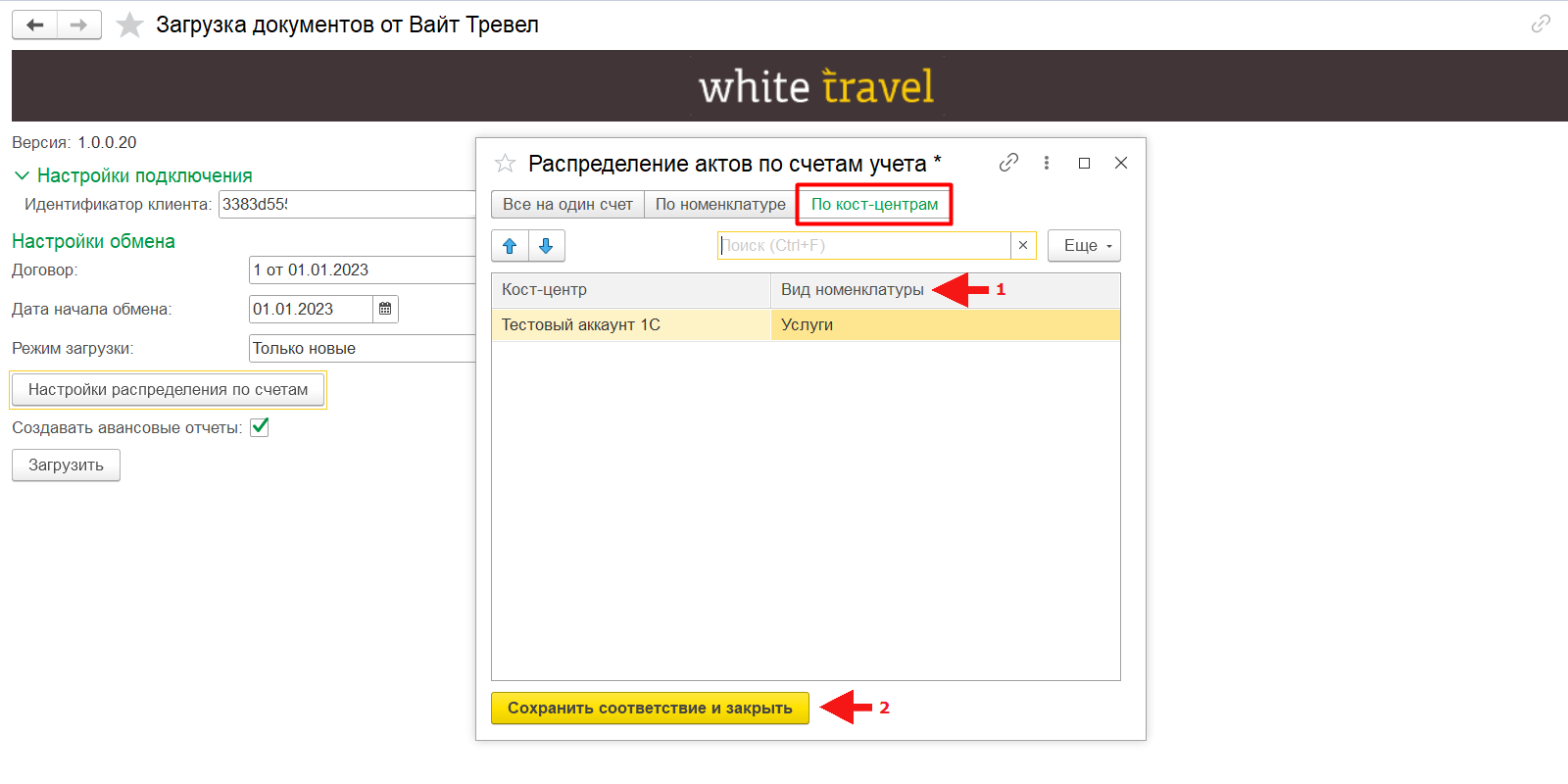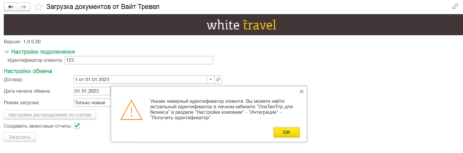 При непройденной проверке идентификатора клиента в обработке «Загрузка документов от Вайт Тревел» отобразится уведомление об ошибке. Необходимо проверить корректность идентификатора клиента в личном кабинете «OneTwoTrip для бизнеса» и повторить попытку активации.