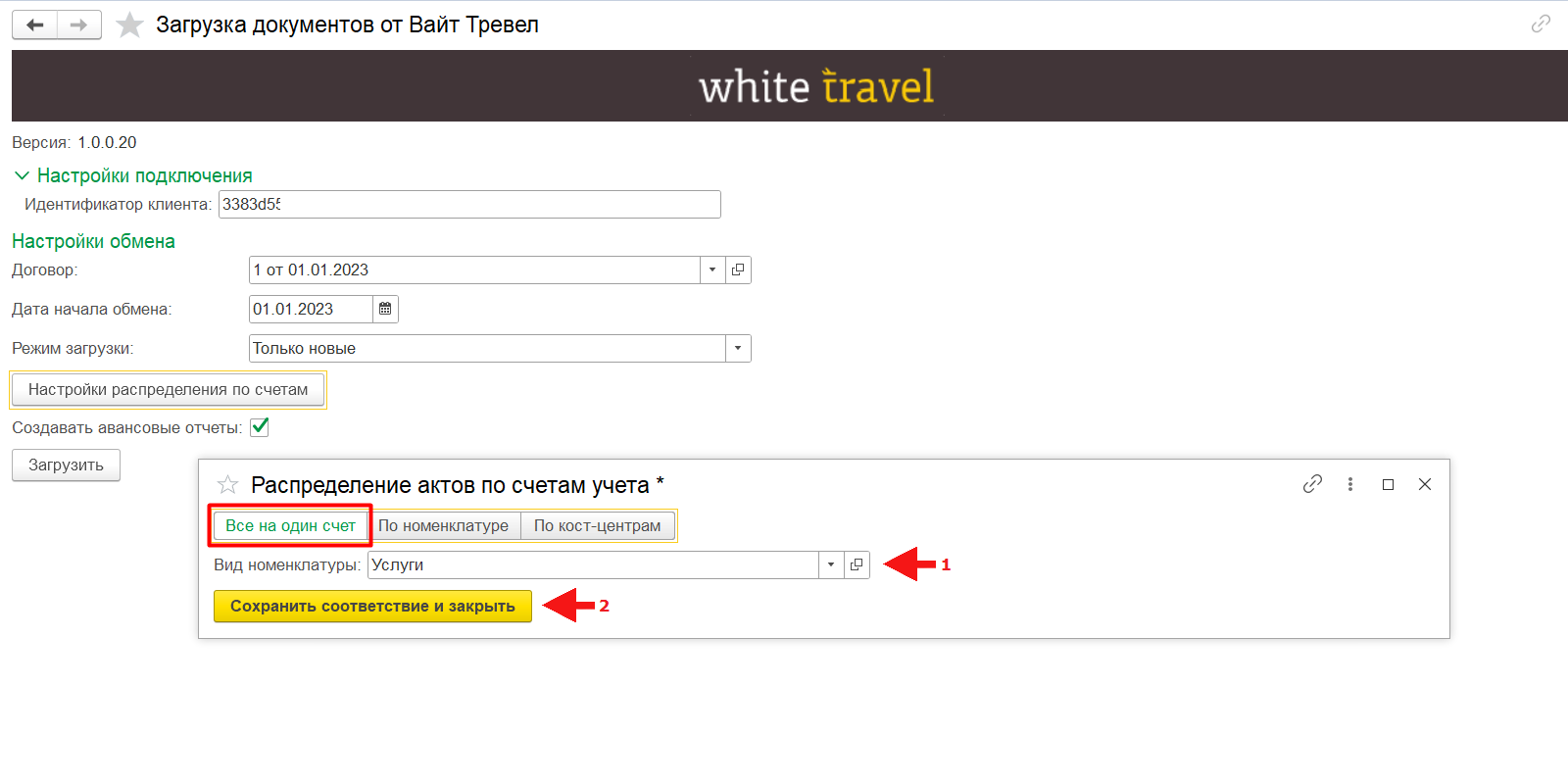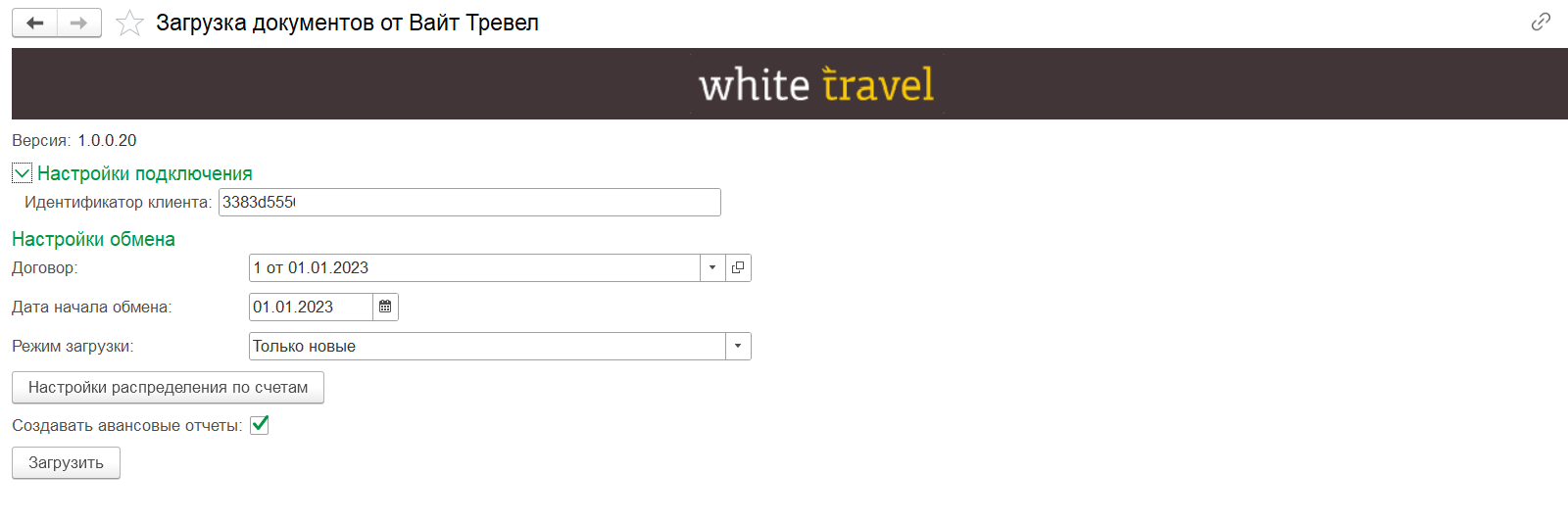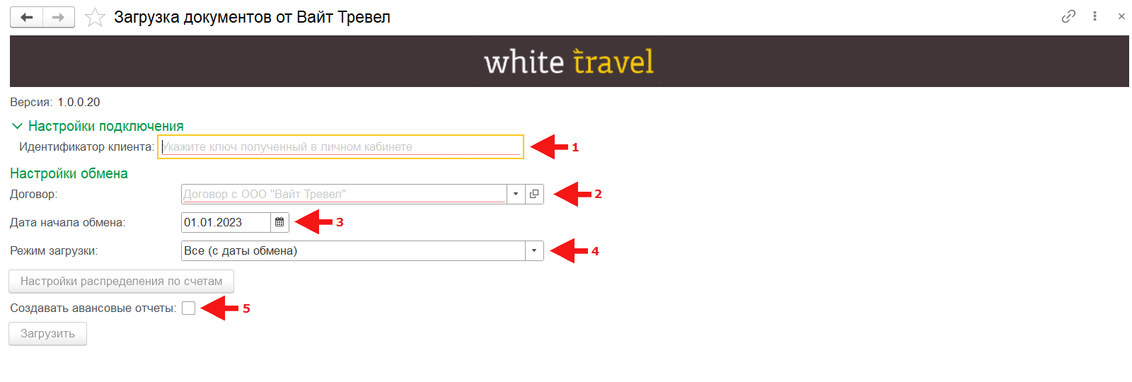 В обработке «Загрузка документов от Вайт Тревел» («Покупки» →«Сервис») необходимо заполнить: