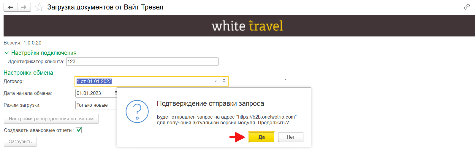 После заполнения данных необходимо подтвердить отправку запроса на сервер «OneTwoTrip для бизнеса» для проверки актуальности версии модуля и идентификатора клиента с помощью команды «Да».