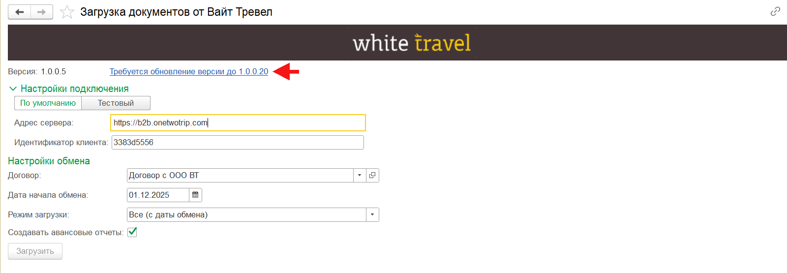 При непройденной проверке актуальности версии модуля в обработке «Загрузка документов от Вайт Тревел» (раздел «Покупки» — подраздел «Сервис») отобразится гиперссылка «Требуется обновление версии». Необходимо выполнить обновление версии модуля (раздел инструкции «Обновление модуля»), а затем повторить попытку активации.