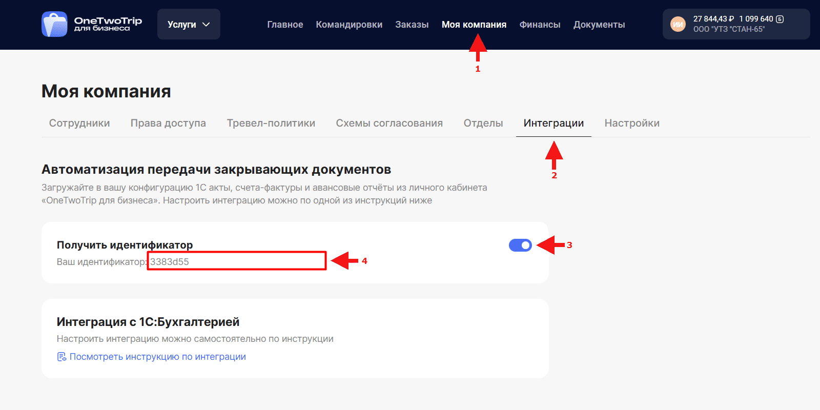 Для активации модуля необходимо перейти в раздел «Моя компания» в личном кабинете «OneTwoTrip для бизнеса» , подраздел «Интеграции», активировать получение идентификатора с помощью переключателя,