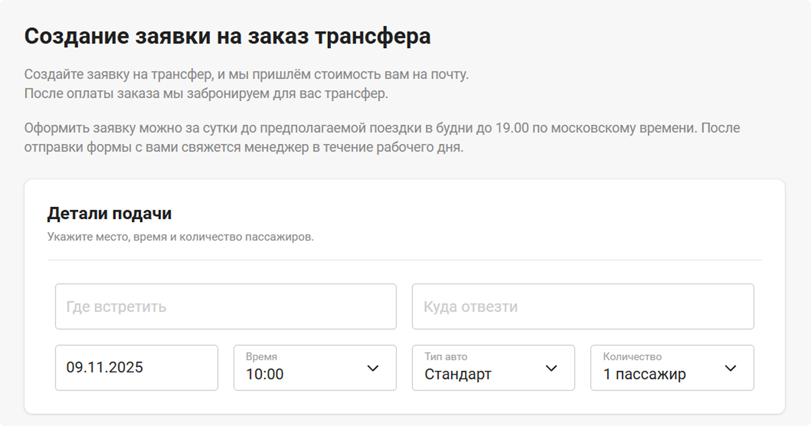 - Добавьте важные детали: номер рейса или поезда, дополнительные услуги — например, проезд по платной дороге, встречу с табличкой. Менеджер уточнит, какие варианты доступны.