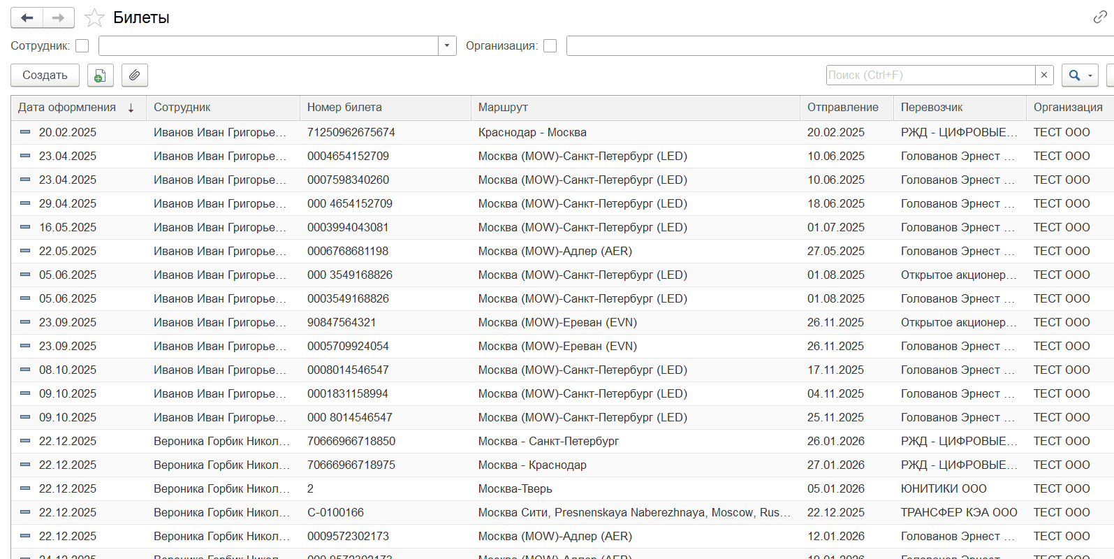 В открывшемся окне отобразится список загруженных элементов справочника «Билеты» в таблице с возможностью отборов по дате оформления, сотруднику, номеру билета, маршруту, дате отправления, перевозчику, организации. Для открытия элемента справочника «Билеты» необходимо двойным кликом выбрать соответствующую строку с билетом в таблице.