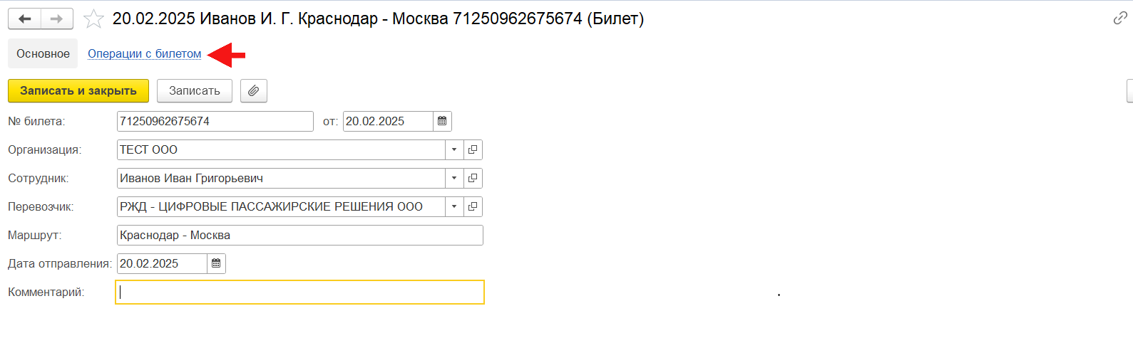 В открывшейся форме элемента справочника «Билеты» в элементе навигации «Основное» отображаются реквизиты, содержащие данные билета: номер билета, дата оформления, организация, сотрудник, перевозчик, маршрут, дата отправления и комментарий. Для просмотра данных элемента навигации «Операции с билетом» необходимо перейти по гиперссылке «Операции с билетом».