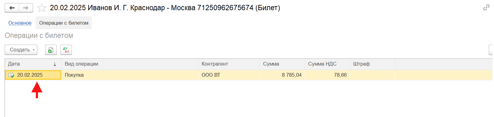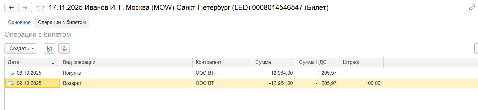 При наличии оформленного возврата билета в табличной части отобразится строка с документом «Операция с билетом» с видом операции «Возврат» для удобства контроля операций с услугами.